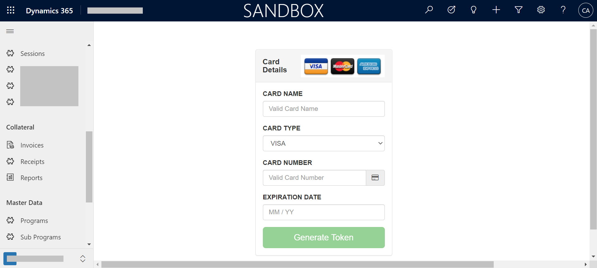The code snippet below represents part of the Tokenisation.html. Referring to this code snippet, the function generateToken() (line 32) retrieves the data entered in the ‘Card Tokenisation’ dialog (Figure 4). It also extracts the contact ID (that it, the query string parameter presented in Figure 3 (i.e. ?data=customerid%3d%7b66C762A0-E3D5…) )
