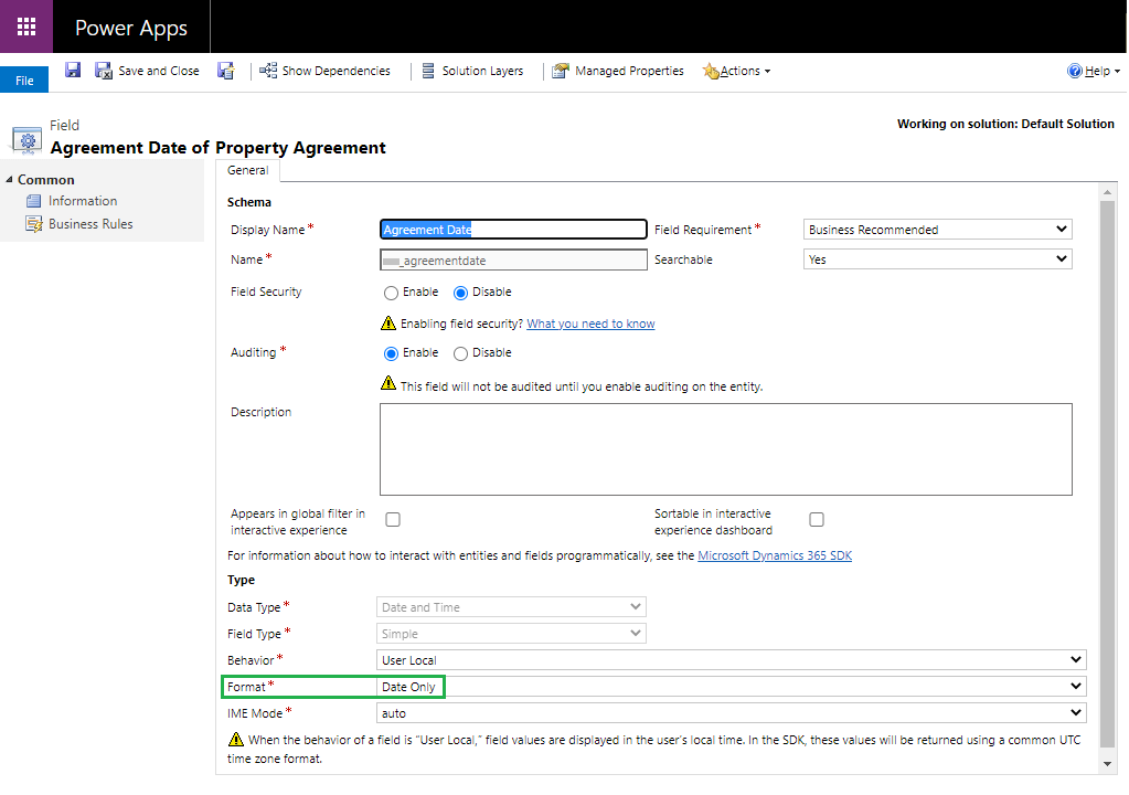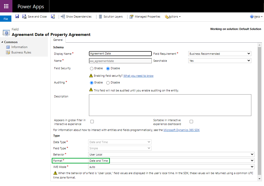 Referring to Figure 2 (the environment is set to GMT+11hrs), the ‘Agreement Date’ (Data type = Date and Time) can be configured differently in Dataverse. For example: