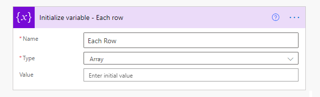 Referring to Figure 3, the second action is ‘Initialize variable – Each row’ (‘Variable’ actions are shown in Figure 10). The expanded form of this is displayed in Figure 4. This action defines the array that the CSV data will be placed into