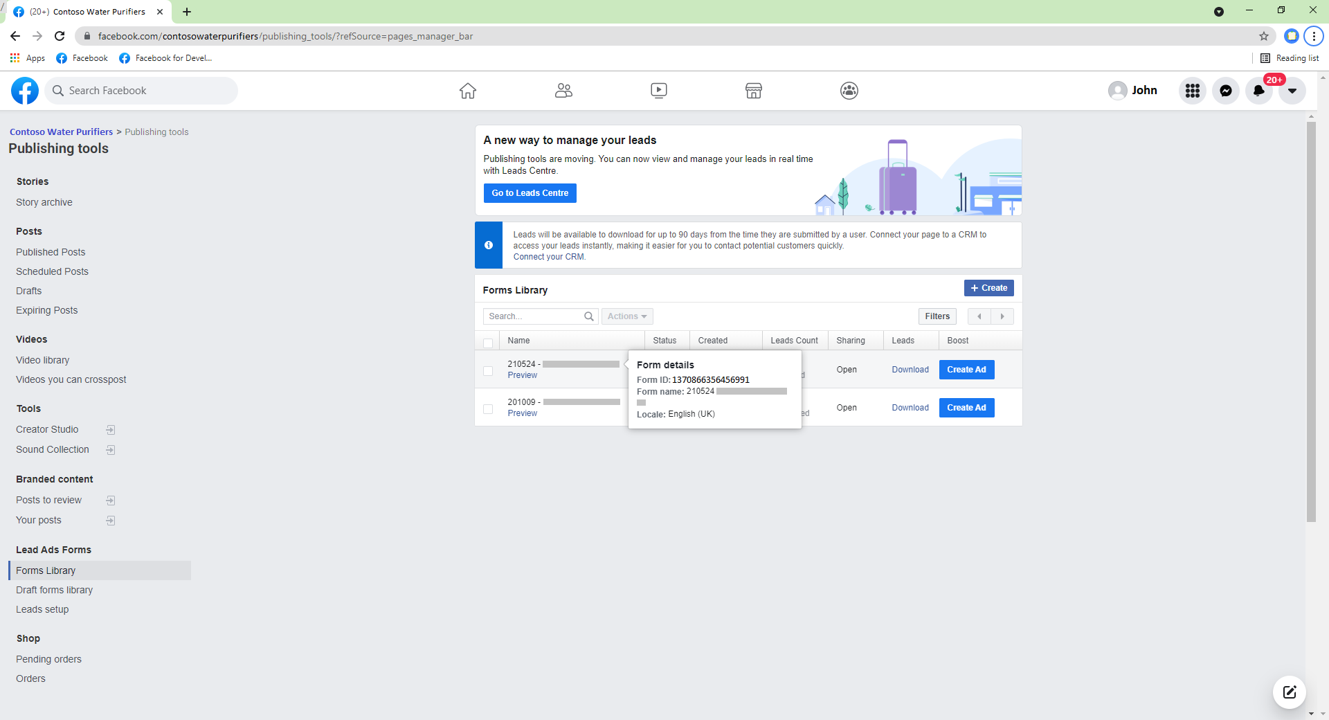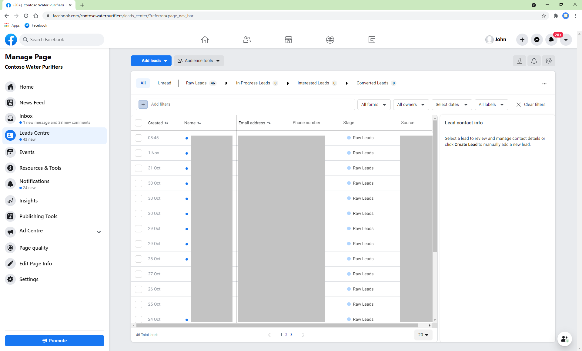4.) Using his Contoso Facebook account, he views the Facebook page ‘Contoso Water Purifiers’. He views all the Leads in the Page’s ‘Leads Centre’ (Figure 1)