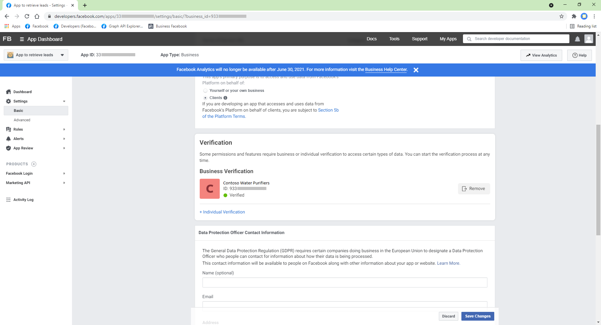 John creates a ‘Contoso’ Facebook Business Manager account. The account now automatically owns the business app ‘App to retrieve Leads’. This app will then need to be business verified by Facebook (Figure 6). Once verified, the business app will be able to retrieve leads.