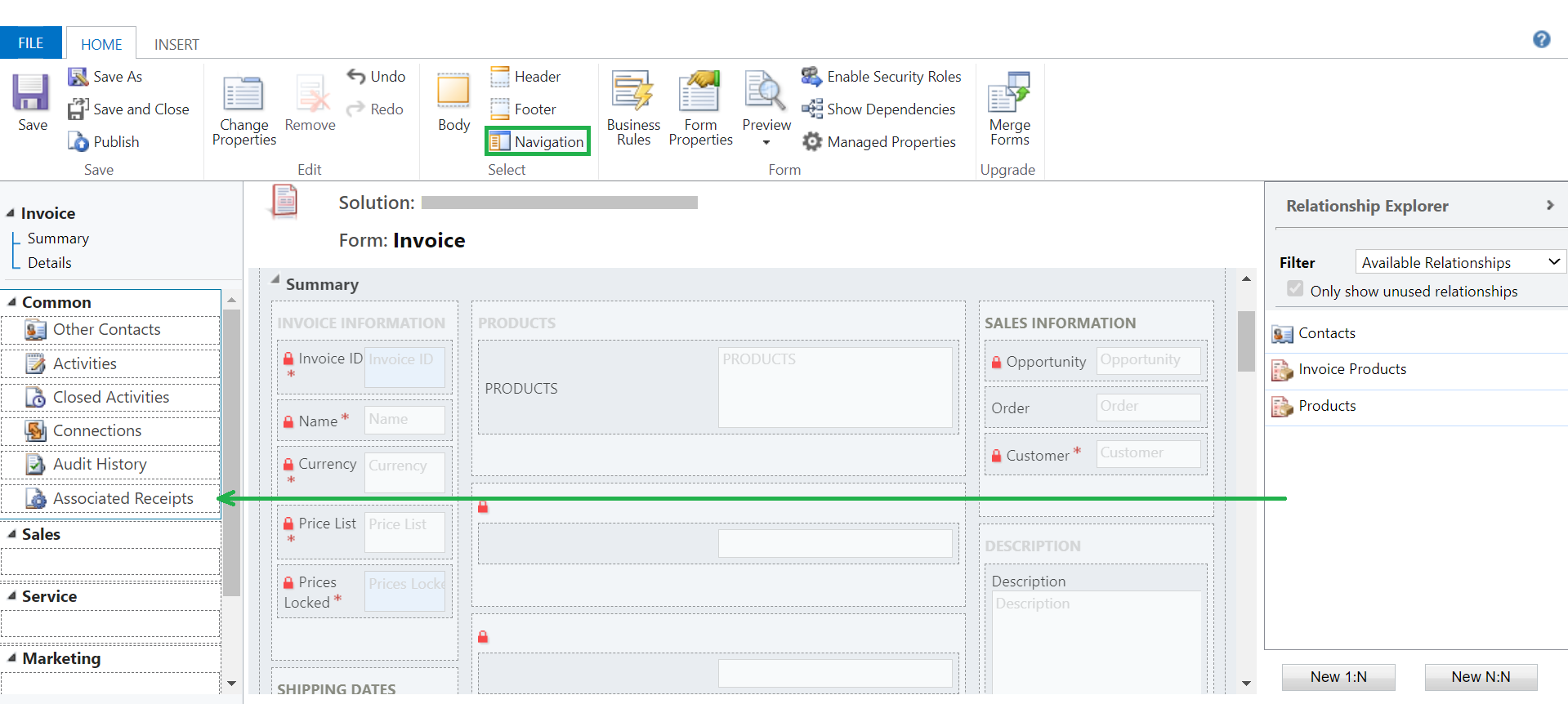 4.) The ‘Show navigation items’ is selected on the Invoice form