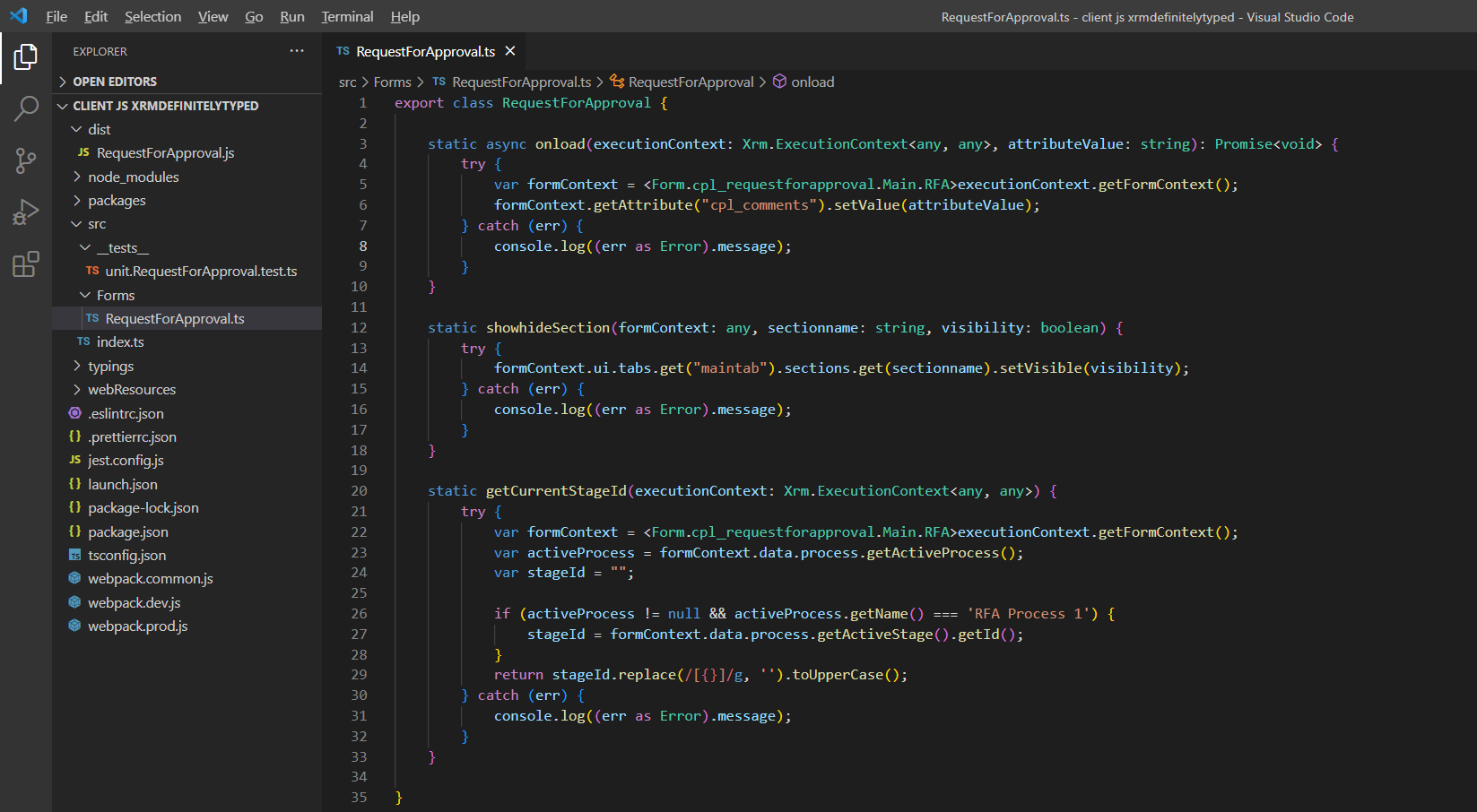 • npm packages: xrm-mock, TypeScript, Jest, esLint, Prettier & webpack