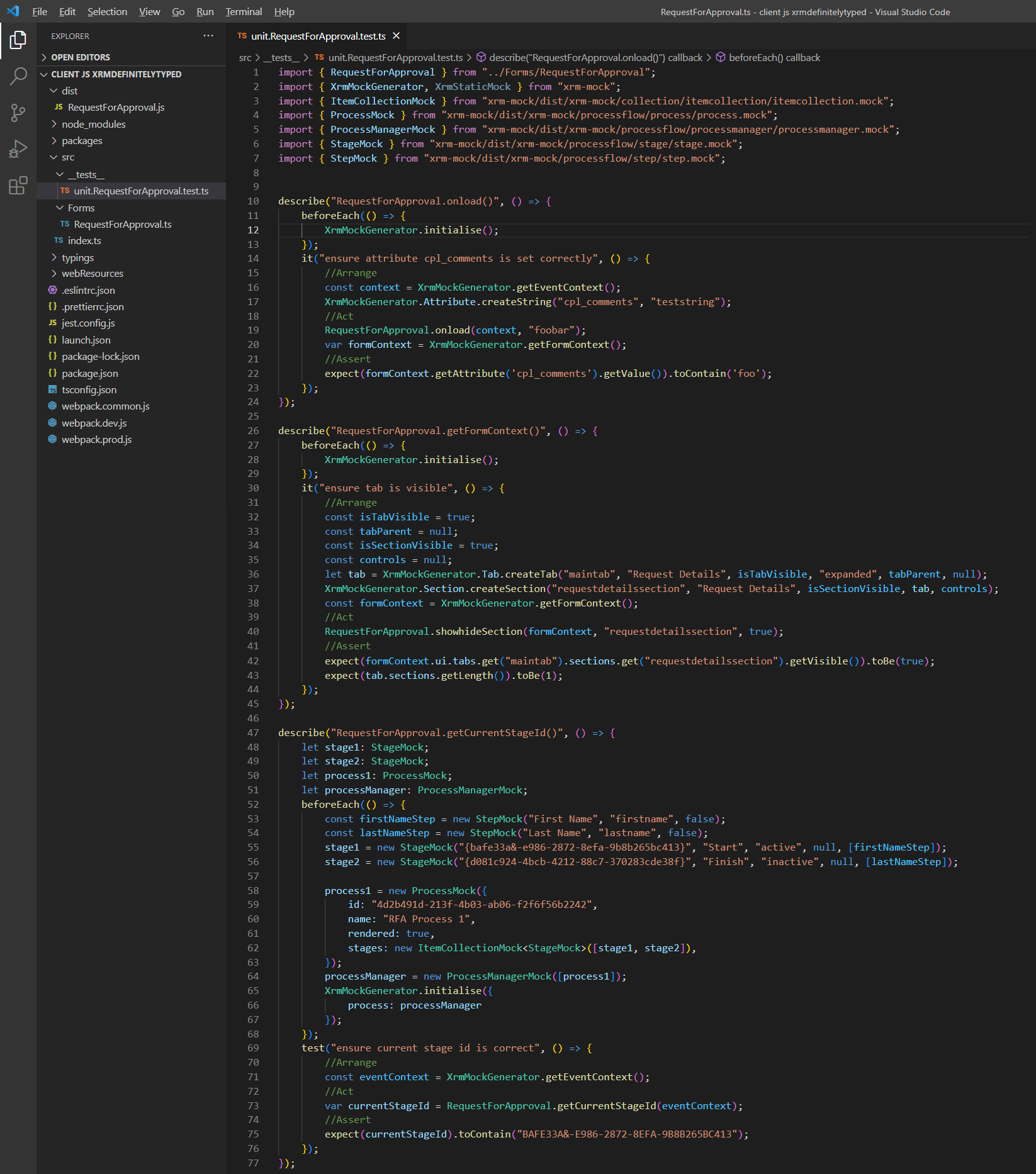 The post provides a few examples of unit tests for Dynamics 365 client-side TypeScript (Figure 6). It also describes, at a very high level, some of the configuration required to achieve this. For a detailed description, please refer to the references