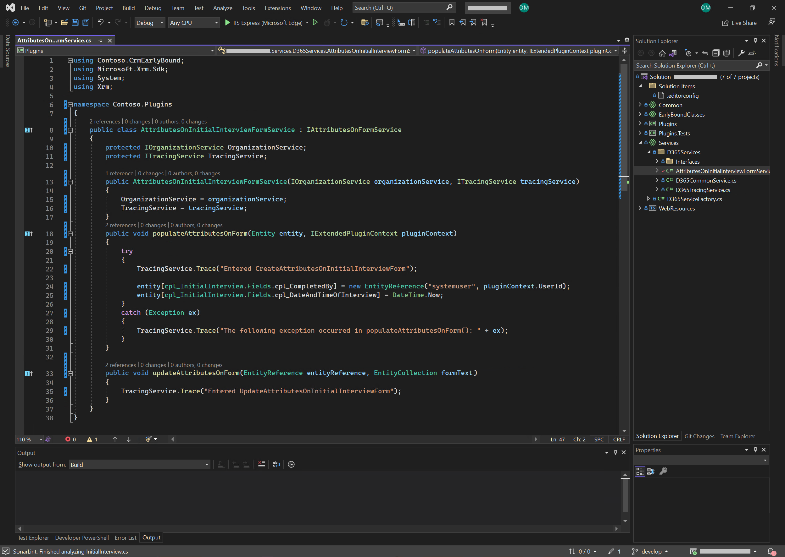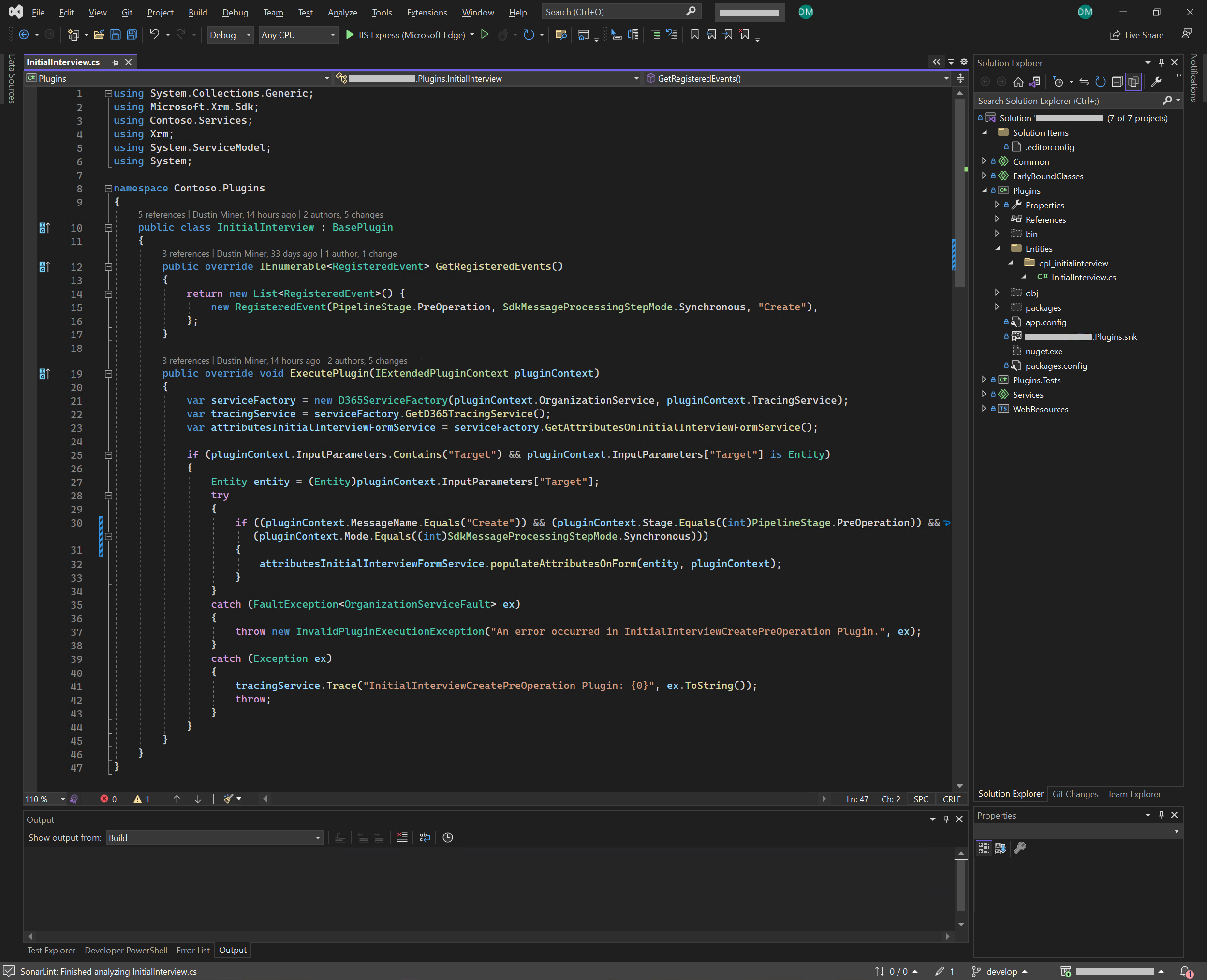 On line 10 of Figure 1, it implements BasePlugin rather than the IPlugin interface. BasePlugin has been designed by JourneyTeam.Xrm. There are benefits to using a wrapper like this rather than directly using IPlugin. One of the benefits is specifying the events that the plugin will handle (as defined on line 15). This specifies that the plugin is expecting the specified event to be registered. If another event is registered by mistake, it will generate a plug-in trace log message such as: “No Registered Event found for event: Update, Entity: cpl_initialinterview, and Stage: PreValidation!”