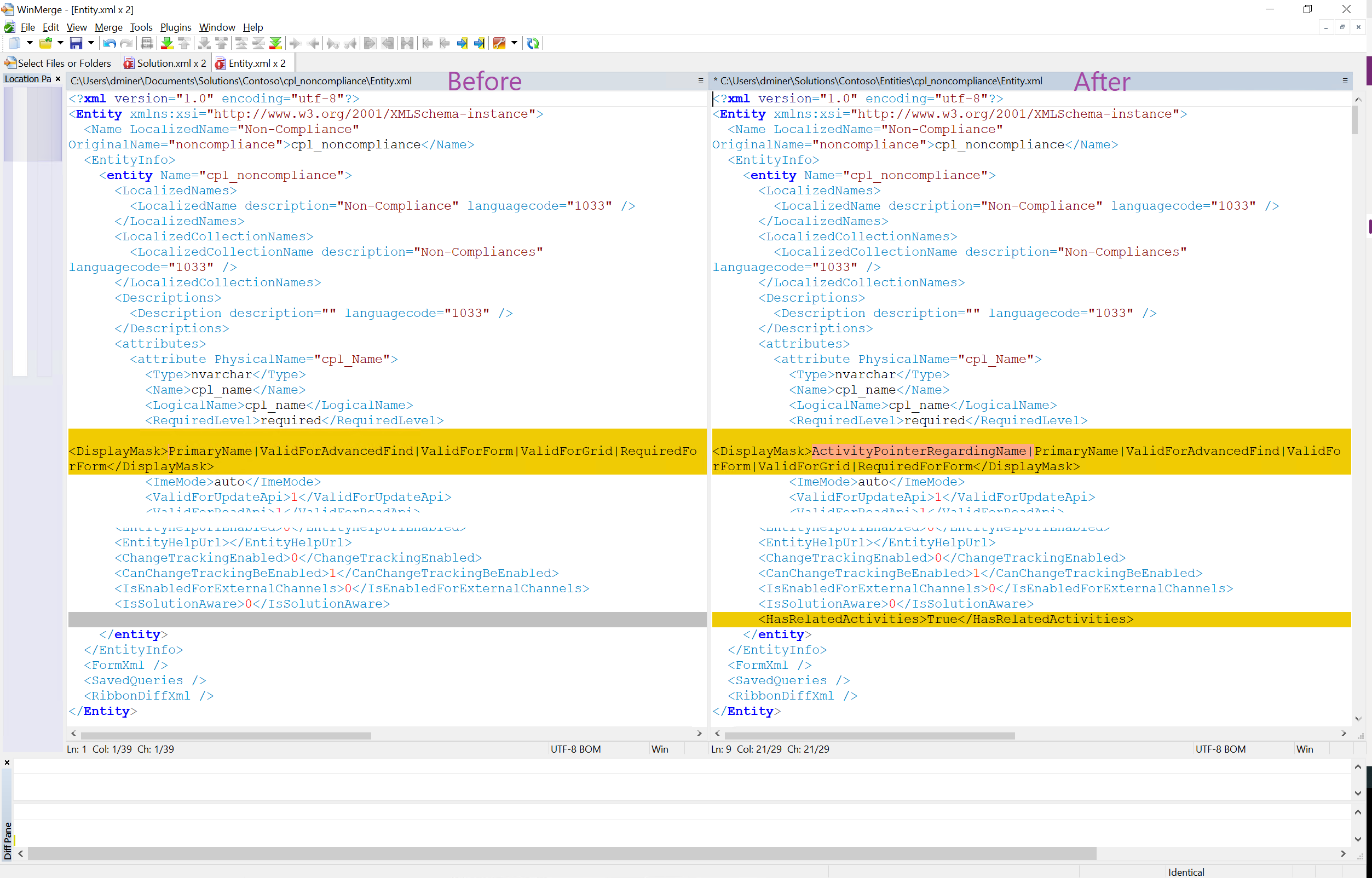 2. compare (using a tool such as WinMerge Figure 3) the unpacked solution to the one already stored in the products-contoso repository (Figure 1)