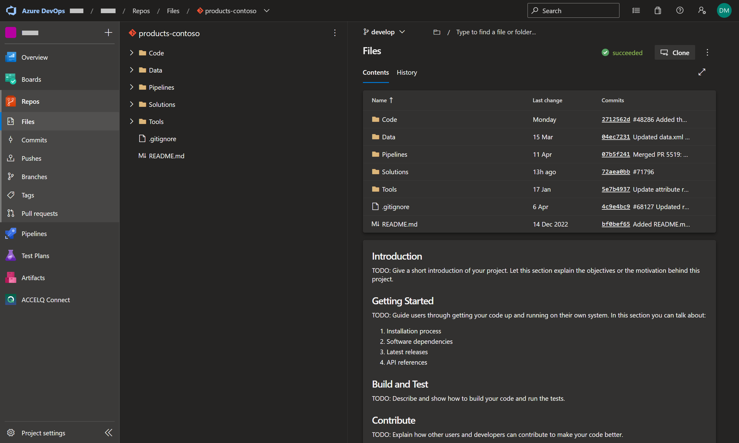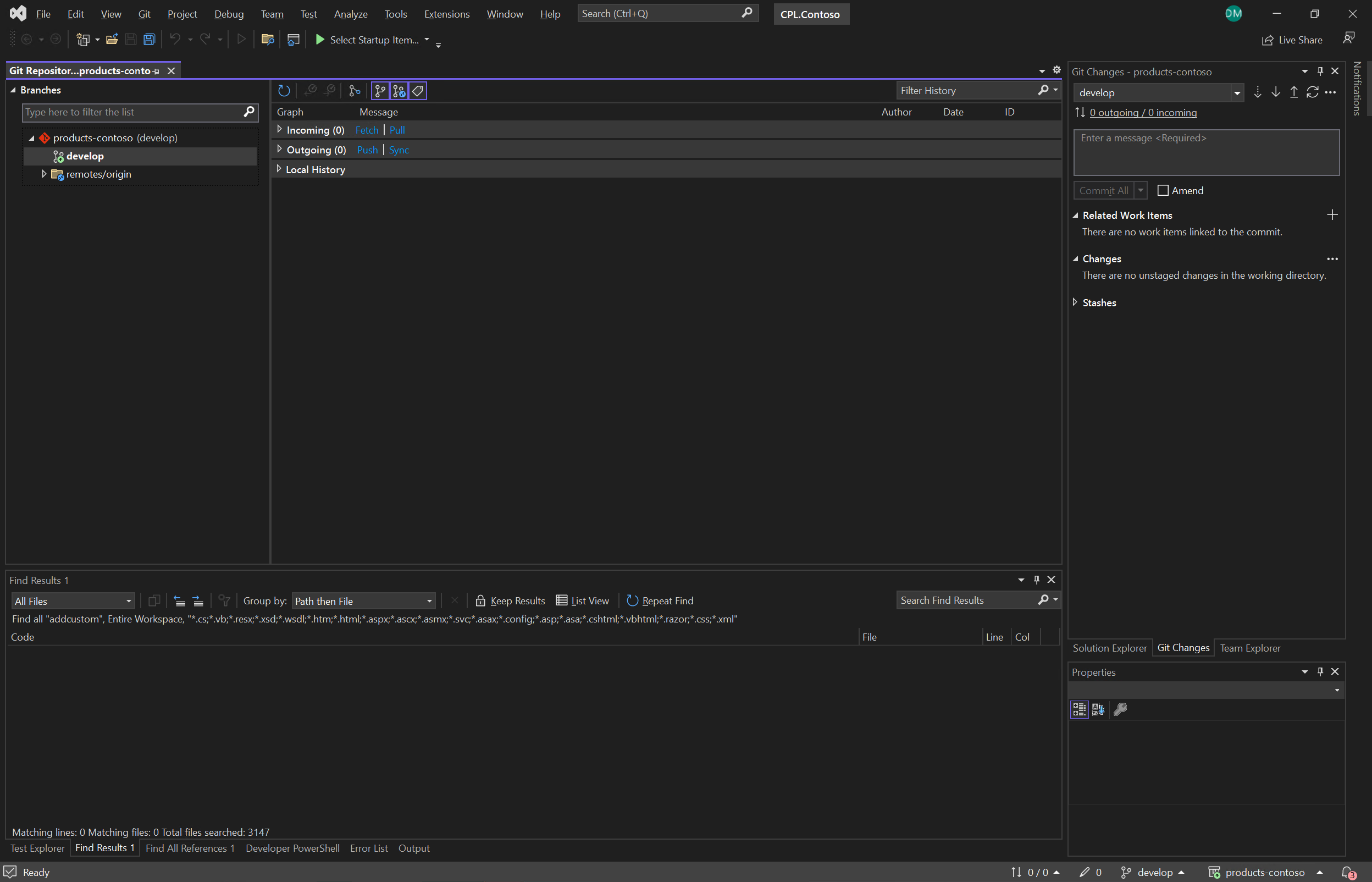 Referring to Figure 1, the ‘products-contoso’ repository contains a develop branch. Referring to Figure 2, a local develop branch has been created from this branch. The contents of the local develop branch can be viewed on the local file system (Figure 3)
