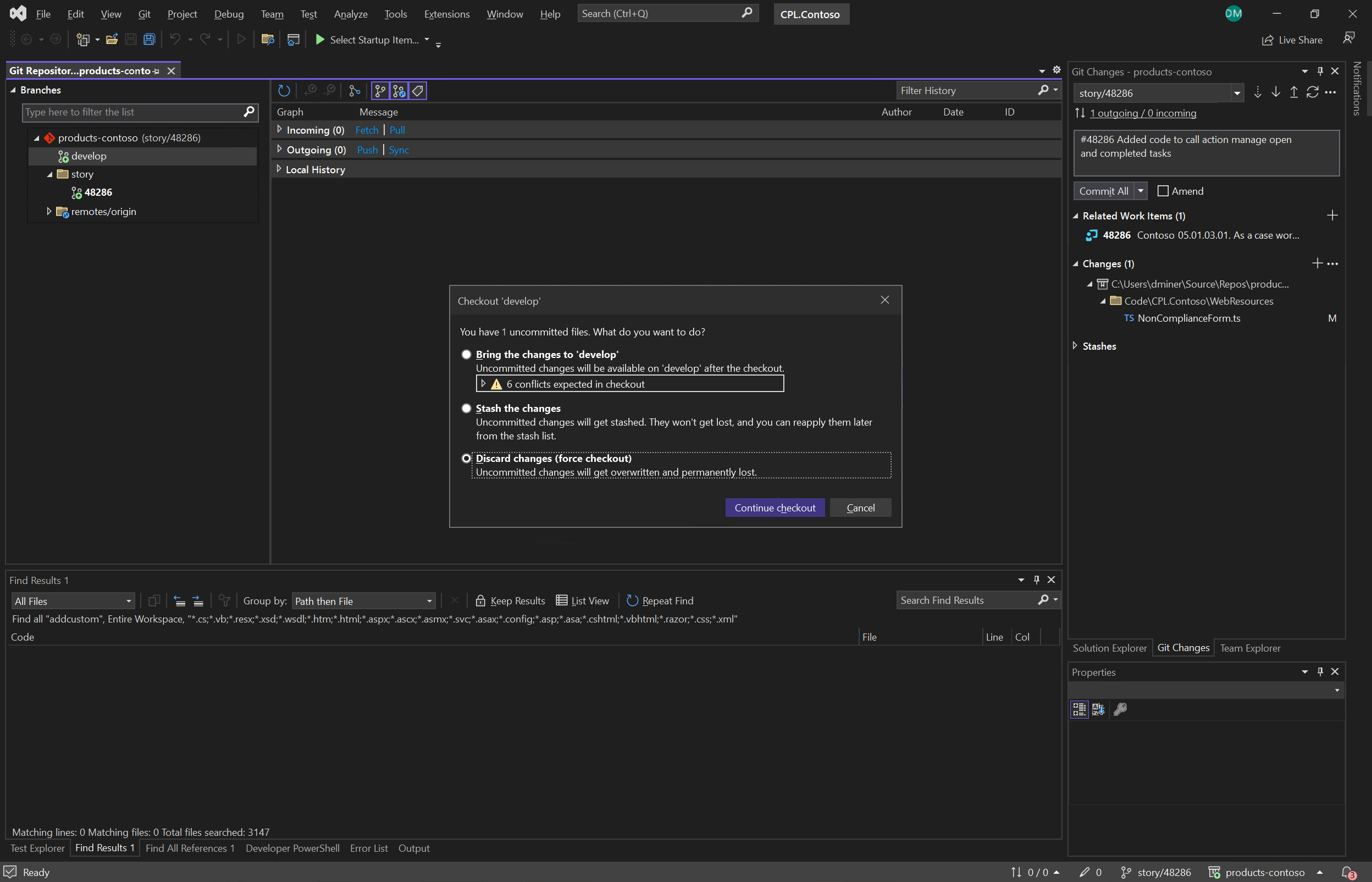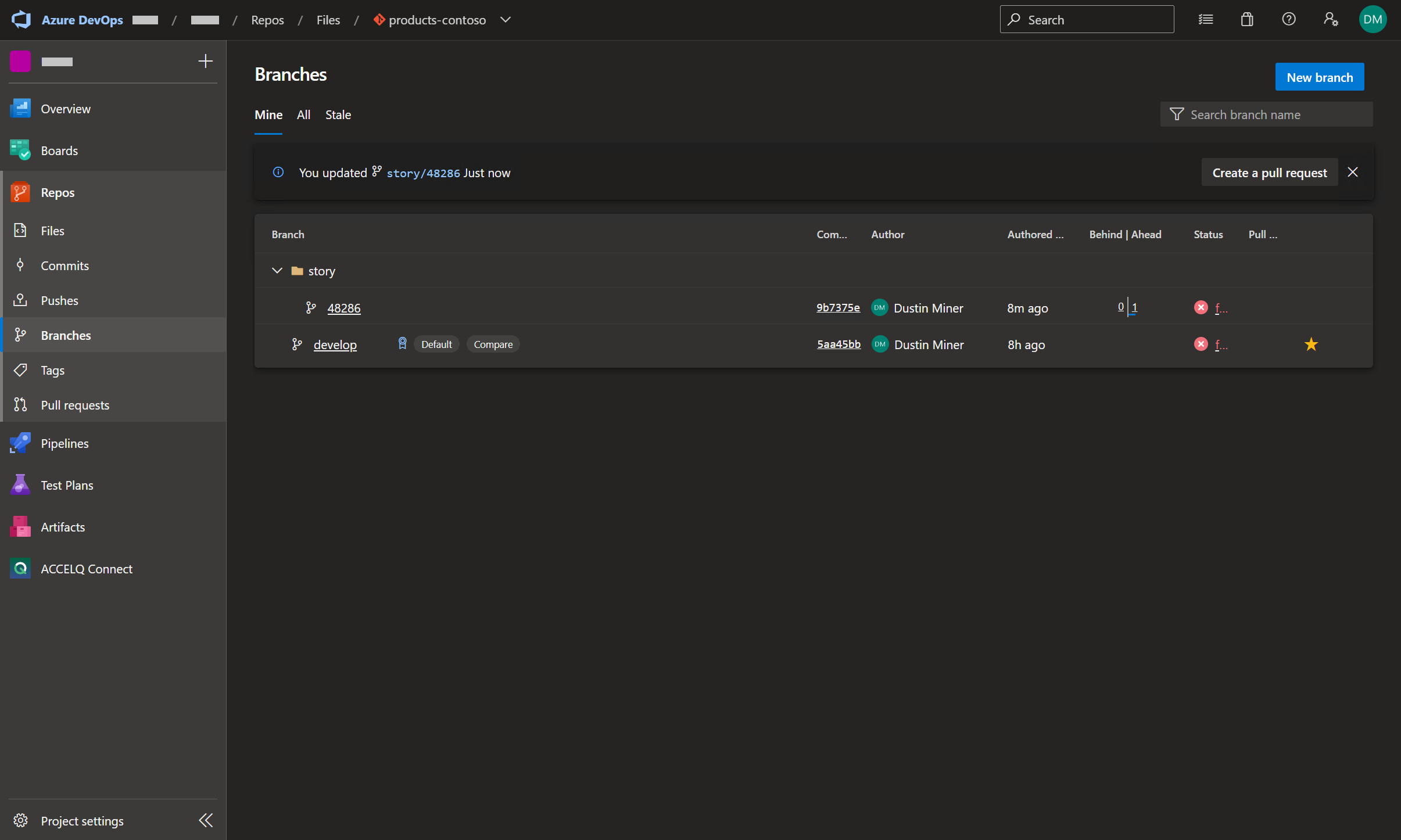 The changes in user story branch ‘story/48286’ are now ready to be placed in a pull request. Once the pull request is complete, the user story branch is merged into the develop branch within Azure DevOps repos ‘products-contoso’