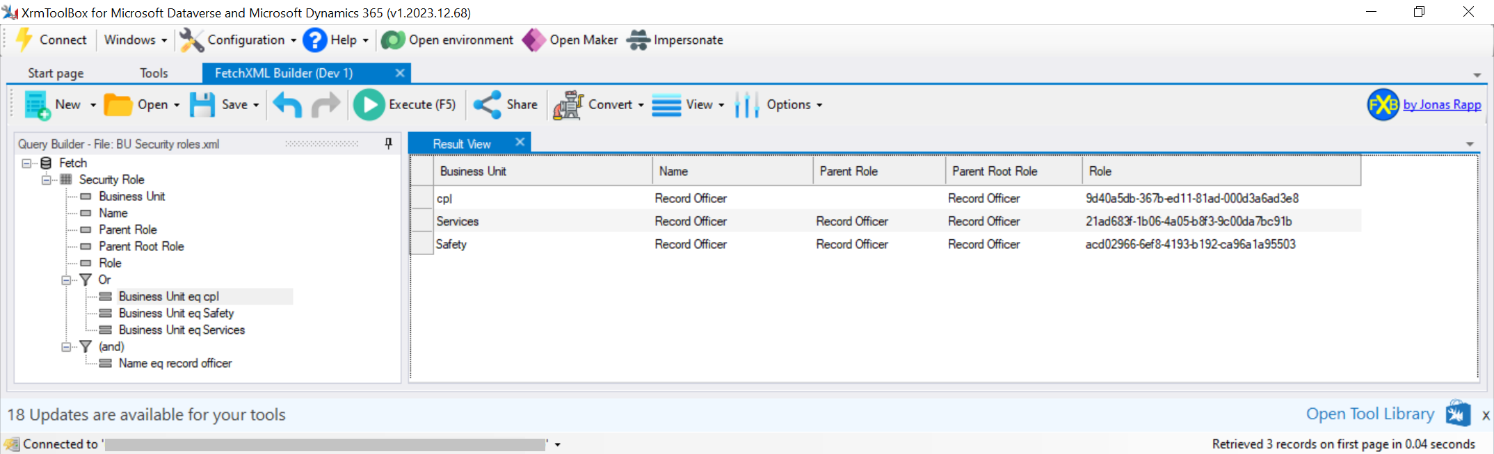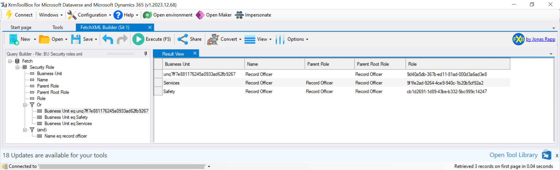 Consider the situation where a TypeScript developer is writing code for the case where the logged in user is residing in the ‘Services’ child business unit (Figure 1). When the developer is working in their Dev 1 environment (Figure 2), they would hardcode the ‘Record Officer’ role to an id of 21ad683f-1b06-4a05-b8f3-9c00da-7bc91b. However, when the code is moved to Sit 1 (Figure 3), the id is different and thus the TypeScript code would stop working