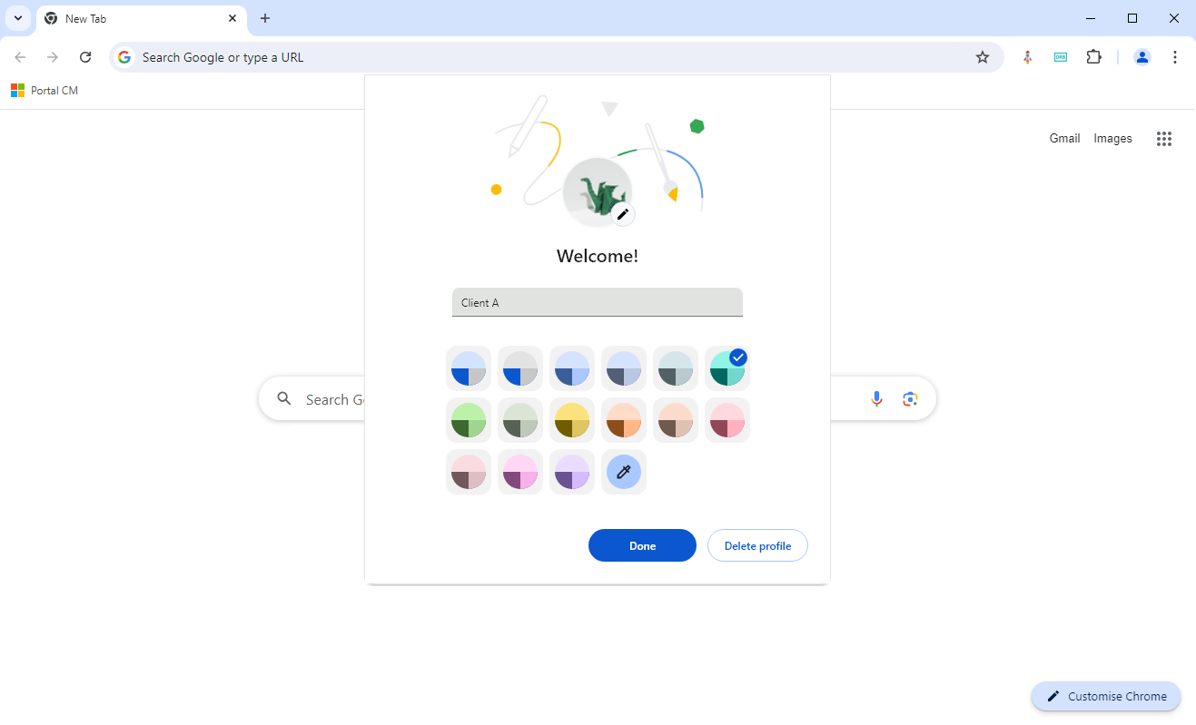 2.) Pick a theme colour and add an avatar. Then enter the name of the profile (e.g. Client A)